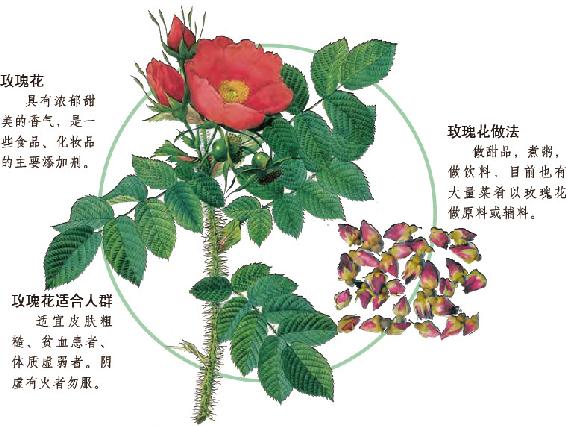 玫瑰因枝秆多刺,故有“刺玫花”之称。玫瑰花可提取高级香料玫瑰油,玫瑰油价值比黄金还要昂贵,故玫瑰有“金花”之称。最重要的是它的养颜美容功效,常饮可去除皮肤上的黑斑,令皮肤嫩白自然,对防皱纹也有帮助。肝郁气滞型的减肥可多喝,有助于减肥;有丰胸调经之效;还可润肠通便。是美容养颜瘦身的佳品。