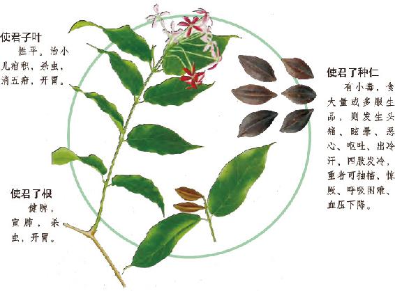 相传潘洲医生郭使君治疗小儿诸疾独用此药,且疗效较好,后人为了纪念他,号此药为使君子。凡大人小儿有虫病,清晨空腹食使君子仁数枚,或以壳煎汤咽下,次日虫皆死而出也。此物味甘气温,既能杀虫,又益脾胃,所以能敛虚热而止泻痢,为小儿诸病要药。