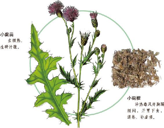 小蓟,山东俗名萋萋菜,萋字当为蓟字之转音,因其多刺如枪刀也,奉天俗名枪刀菜。其根与茎皆可用,而根之性尤良。一般是剖取鲜者捣烂,取其自然汁开水服之。如果要入煎剂也不可久煎,宜保其新鲜之性,约煎四、五沸即取汤饮之。如果小蓟的茎中生虫便会结成疙瘩,状如小枣,其凉血之力尤胜。用时宜选取其生农田间嫩而白者。