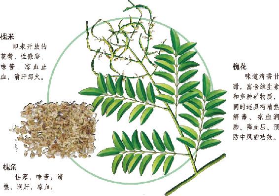 采集保存:夏季花未开放时采收其花蕾,称为“槐米”;花开放时采收,称为“槐花”。采收后除去花序的枝、梗及杂质,及时干燥。