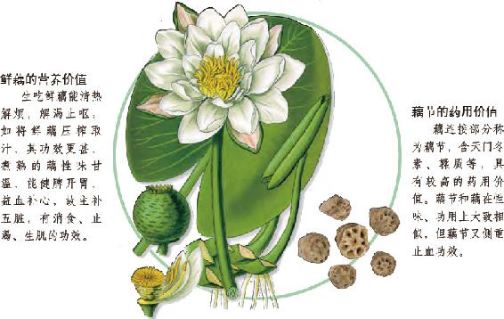 鲜藕微甜而脆,可生食也可做菜,而且药用价值相当高,它的根根叶叶,花须果实,无不为宝,都可滋补入药。用藕制成粉,能消食止泻,开胃清热,滋补养性,预防内出血,是妇孺童妪、体弱多病者上好的流质食品和滋补佳珍,在清咸丰年间,就被钦定为御膳贡品。藕原产于印度,后来引入中国。