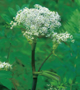 形态:多年生草本。茎直立,呈圆柱形,中空,表面有纵直的沟纹。叶互生,复伞形花序,小花白色。双悬果卵形。