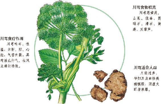 川芎原名芎,因为以四川产的最为有名,所以又被称为川芎。川芎既能活血化瘀,又能行气止痛,为“血中之气药”,可用于治多种妇产科的疾病。最重要的是能“上行头目”,祛风止痛,又系治疗头痛良方,尤以疗理风寒、风热、血虚之头痛著称。