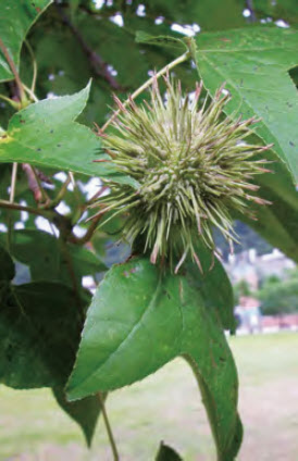形态:落叶乔木,树皮灰褐色,叶薄革质,阔卵形。头状果序圆球形,木质。种子多数,褐色,多角形或有窄翅。