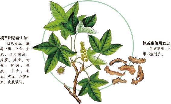 枫香树是一种散发香味的树,叶片压碎时会释放出香味,树皮更香,这是因为里面含有“安息香”树脂。枫香脂是一种很好的祛痰剂,治疗支气管感染的药剂也是源自枫香脂。枫香脂还可以用于治疗皮肤病和寄生虫。许多化妆品中也含有枫香脂,通常是与玫瑰香及金缕梅混合制成化妆用收敛剂。