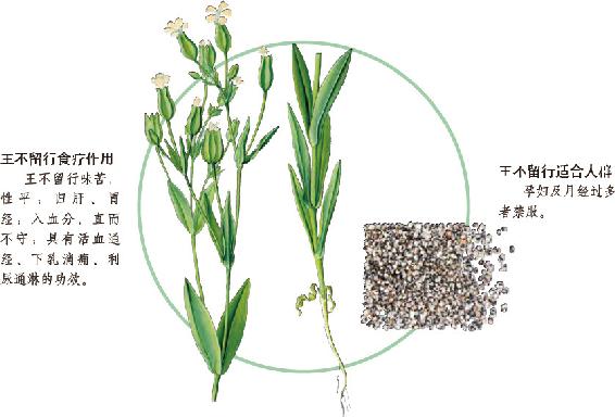 行王不留行以善于行血知名“虽有王命不能留其行”,所以叫“王不留行”,但流血不止者,它又可以止血。在妇科中,王不留行又是发乳的良药,常与穿山甲同用,其特点是善于通利血脉,活血通经,走而不守,用于经行不畅、痛经及经闭,常配当归、川芎、香附、红花等药用。