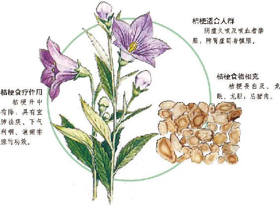 桔梗为桔梗科植物桔梗的根,除含糖量较高外,还含较丰富的维生素B1、维生素C等。桔梗有祛痰作用,并能降低胆固醇的含量,增加胆酸的分泌。此外还有解热、镇痛、抗炎、镇静等作用。可作为咳嗽痰多、咽喉肿痛、肺痈吐脓等病症的辅助食疗。