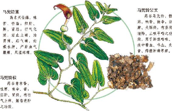 果实药材名马兜铃,为清肺镇咳化痰药;茎药材名天仙藤,能祛风活血;根药材名青木香,有解毒、利尿、理气止痛的功效。《救荒本草》中记载马兜铃的嫩叶可以焯熟后凉拌,但是现代研究发现马兜铃中所含的马兜铃酸对肾脏有明显的损害,因此不宜食用。