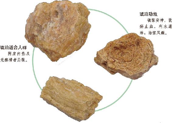《本草纲目》言“虎死则精魄入地化为石,此物状似之,故谓之虎魄”,为古代枫树、松树等的树脂埋藏于地层中,经多年而形成的化石。可安五脏、定魂魄、有止血生肌、促进外伤金疮愈合、清肺通利小肠的作用。