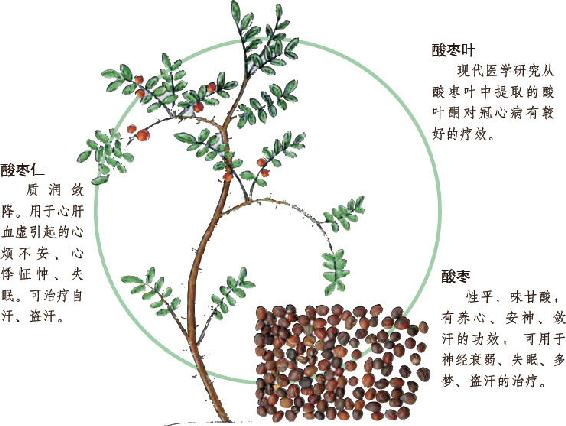 酸枣被证明具有防病抗衰老与养颜益寿的作用。常喝酸枣汁则可以益气健脾,能改善面色不荣、皮肤干枯、形体消瘦、面目浮肿等症状。此外,酸枣中含有大量维生素E,可以促进血液循环和组织生长,使皮肤与毛发具有光泽,让面部皱纹舒展。酸枣仁可补中益肝、壮筋骨、助阴气,能使人肥健。