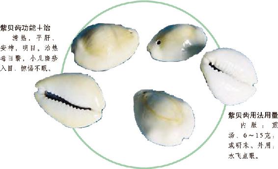 紫贝齿呈卵圆形,背部隆起腹扁平,沟缘细齿背斑点,有清肝明目与镇惊的功效。以紫色光亮、背有斑点、壳厚完整者为佳。另有白贝齿,为同科动物货贝或环纹货贝等贝壳,功能清热,利尿。适用于伤寒热狂、水气浮肿、淋痛溺血、小便不通等症,与紫贝齿功用不同,不可混用。