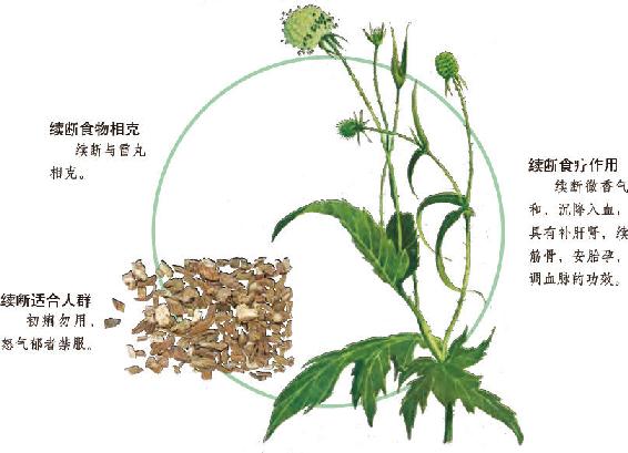 续断因能“续折接骨”而得名。临床常用于肝肾不足、腰膝酸痛、跌打损伤、筋断骨折,以及肾虚遗精、胎动胎漏等症。现代分析续断含生物碱、挥发油及维生素E等成分,有抑制肺炎双球菌及抗阴道滴虫作用。