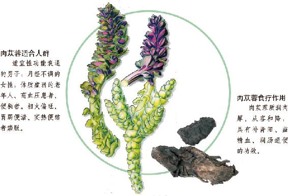 羊肉(瘦)100克,肉苁蓉200克,甘薯50克,大葱3克,姜、盐各2克。将肉苁蓉刮去鳞,用酒洗去黑汁。切成薄片,同甘薯、羊肉共放入锅中,加入姜(切片)和水适量,大火煮沸,再用小火煎煮35分钟,放入葱(切末)、盐即成。本食疗方温补肝肾,主治肾阳虚衰、肝血不足、阳痿、腰痛、头晕目眩、耳鸣。