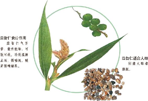 糯米50克,益智仁5克,盐1克。将益智仁研为细末。将糯米煮粥,调入益智仁末,加细盐少许,稍煮片刻,待粥稠停火。本食疗方补肾助阳,固精缩尿。适用于妇女更年期综合征以及老年人脾肾阳虚、腹中冷痛、尿频、遗尿等。阴虚血热者忌服。