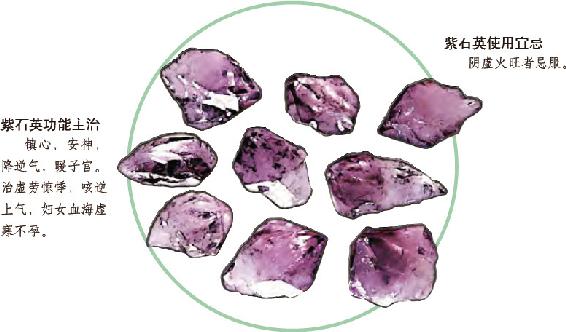 紫石英颜色很少是无色透明的,大部分被染成各种颜色,如黄、浅绿、浅蓝、紫色及紫黑色等,以浅绿、紫色和紫黑色者为最常见。紫石英有兴奋中枢神经,促进卵巢分泌的作用。但所含氧化钙服用过多,对牙齿、骨骼、神经系统、肾、心及甲状腺有损害作用。