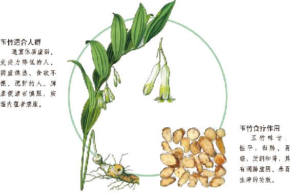 玉竹性寒,味甘平,有滋阴润燥、补虚除烦、生津止渴、美肤养颜之功效。含胡萝卜素、多种维生素以及钙、镁、磷、钠等有益于人体的多种微量元素,非常适用于多种阴虚燥热所致的咳嗽、咽炎、肺结核、糖尿病、过敏性鼻炎等病,其丰富的黏液质中所含有的玉竹黏多糖等,可使皮肤柔嫩细腻而滑润,有良好的美肤养颜功效。
