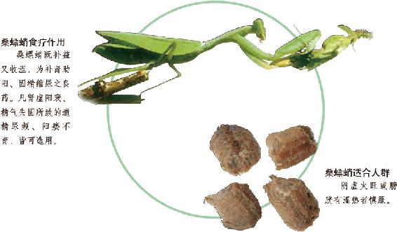 螳螂科昆虫大刀螂、小刀螂或巨斧螳螂的干燥卵鞘。以上三种分别习称“团螵蛸”、“长螵蛸”及“黑螵蛸”。凡肾阳不足,阳痿早泄,可与五味子、补骨脂、附子配伍;或与鹿茸、巴戟天、肉苁蓉、菟丝子、山萸肉等同用,以增温肾止遗之功;凡肾气虚弱,遗精滑泄者,可与龙骨、白茯苓相伍,增益气固精之效。凡肾虚不固,尿多白浊者,可与山茱萸、熟地黄、菟丝子、黄莲合用,以补肾固精,分清别浊。