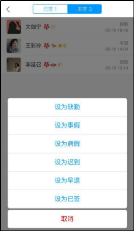 点击已发放的签到活动,您可以看到截至目前的签到“已签/未签”情况,也可以根据实际情况手动修改签到结果,点击学生可编辑为缺勤、事假、病假等(如图)。