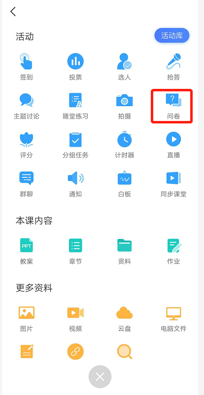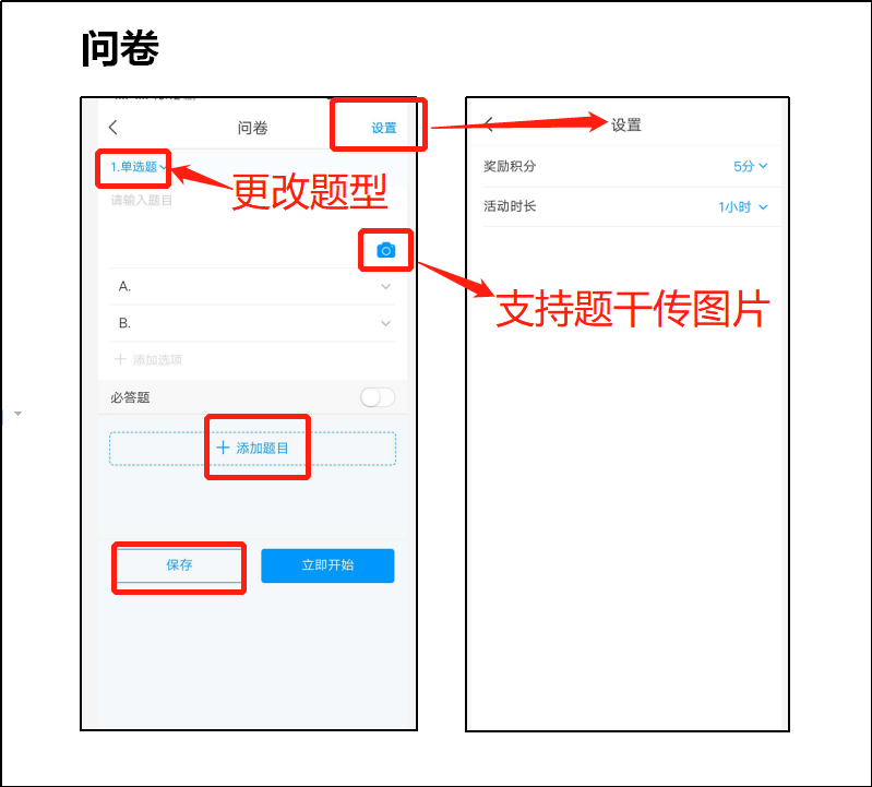 “问卷”支持单选题、多选题和简答题三种题型。可以设置多道题,每道题也可以自主设置选项数量。支持设置奖励积分/活动时长。