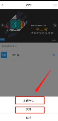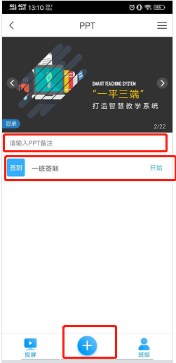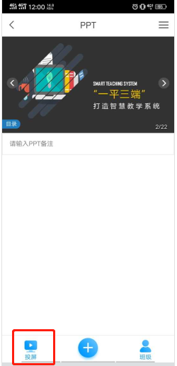 2、上传完成直接点击ppt进入ppt手机端控制界面。点击右下角“投屏”按钮,根据提示在电脑端输入网址及投屏码。(需根据提示选择投屏班级)