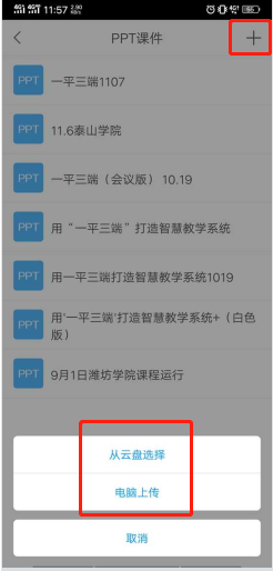 1、学习通打开课程,点击教案按钮,点击右上角"+"加号,从云盘或从电脑上传ppt。(支持ppt\pptx等文件格式)