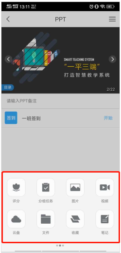 :视频、word文件、图片、链接等),同时可以在此界面进行课堂互动活动的发放(如:签到、抢答、选人、测验等),课堂活动可以先进行保存,等上课时再进行发放。