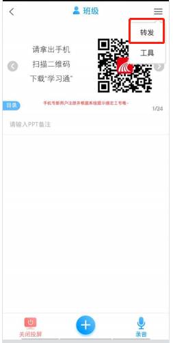 4、课堂ppt讲课完毕,可以在学习通右上角将本节课讲授的ppt直接转发给本班学生,或转发到qq、微信等群聊中进行ppt共享。