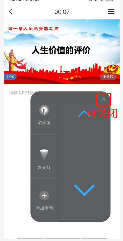 (2)投屏后,手机界面将显示工具按钮,目前支持激光笔/聚光灯/上下翻页等效果。(工具可以关闭)