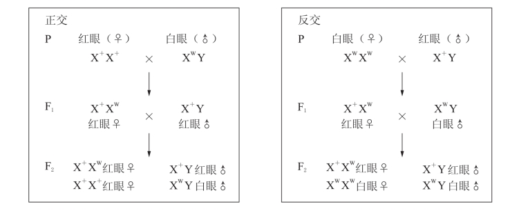本实验用红眼果蝇和白眼果蝇为材料,通过对杂交后代眼色的观察,了解伴性遗传与常染色体遗传的区别。红眼与白眼是一对相对性状,分别由X染色体上的基因X+和Xw决定,X+相对于Xw是显性,因为雌蝇的性染色体组成是XX,雄性的性染色体组成是XY,而Y染色体没有相对应的基因,所以红眼果蝇与白眼果蝇杂交时,正交和反交的结果不同。