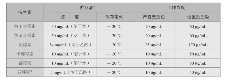 a:以水为溶剂的抗生素贮存液通过0.22 μm滤器过滤除菌。以乙醇为溶剂的抗生素溶液不需要除菌处理。所有抗生素溶液均应放于不透光的容器内保 存。