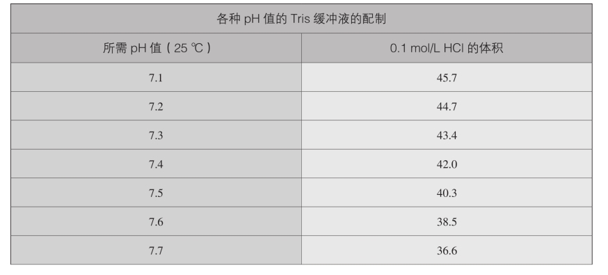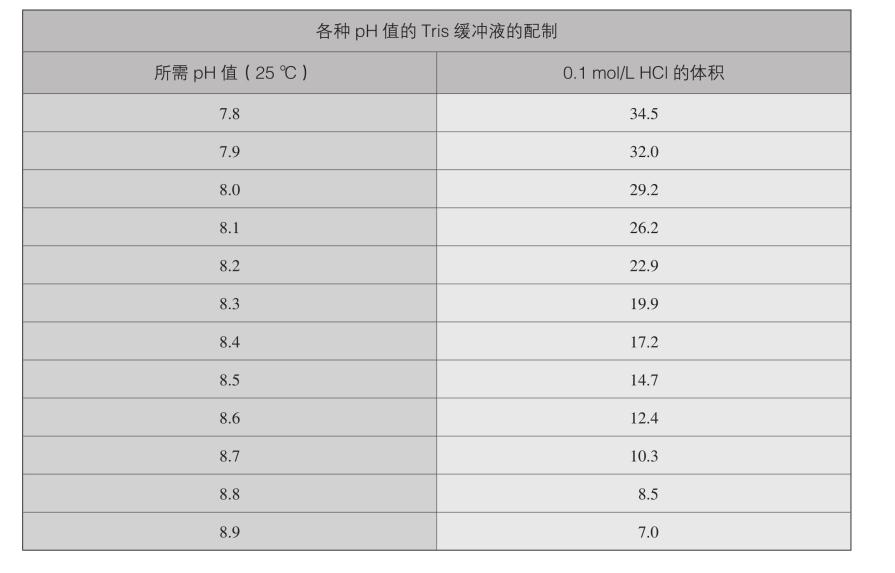 某一特定pH值的0.05mol/L Tris缓冲液的配制:将50mL 0.1mol/L Tris碱溶液与上表所示相应体积(单位:mL)的0.1mol/L HCl混合,加水将体积调至100mL。