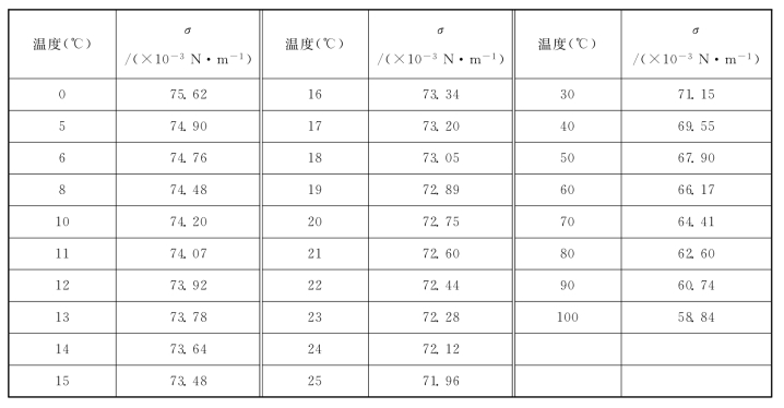 附表7 在不同温度下与空气接触的水的表面张力系数
