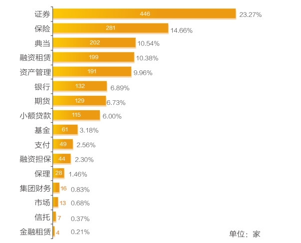 在1917家金融类企业中,证券类企业446家,保险类企业281家,典当类企业202家,融资租赁类企业199家,资产管理类企业191家,银行类企业132家,期货类企业129家,小额贷款类企业115家,基金类企业61家,支付类企业49家,融资担保类企业44家,保理类企业28家,集团财务类企业16家,市场类企业13家,信托类企业7家,金融租赁类企业4家(见图3)。