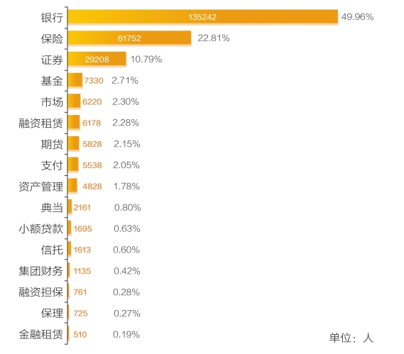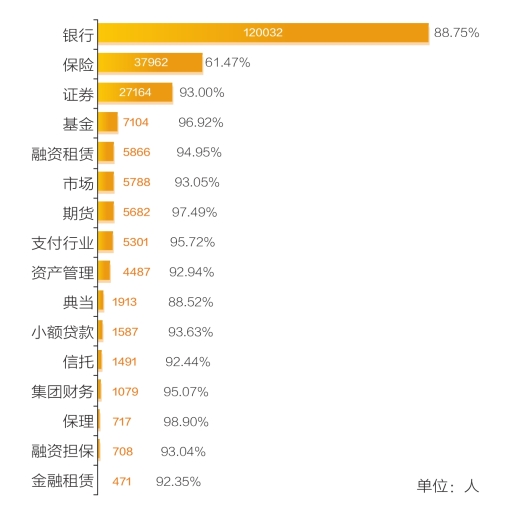 总体上看,银行类、保险类以及证券类从业人员数量,共占从业人员总数的83.56%,其他金融类别数量相对较少。其中,从业人员占比在1%~10%之间的有6个类别,如基金类占2.71%、市场类占2.3%、融资租赁类占2.28%、期货类占2.15%、支付类占2.05%、资产管理类占1.78%。