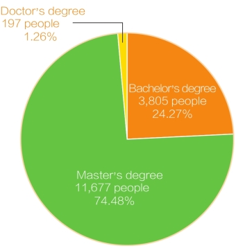 Among the total financial company employees,15,679 have overseas academic background,including 3,805 returning from overseas undergraduate programs,accounting for 24.27%;11,677 from overseas master’s degree programs,accounting for 74.48%; 197 from overseas doctoral programs,accounting for 1.26%(see Figure 16).