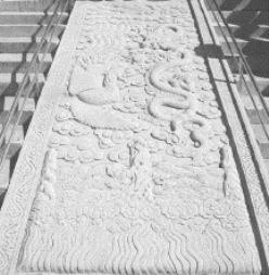 隆恩殿前设月台,月台东西南三面设有青白石栏杆,月台前有三路踏跺,中间踏跺的正中镶嵌有一块丹陛石,丹陛石上浮雕着龙凤呈祥图案,龙凤下面雕刻海水江崖图案,周边则雕刻着蔓草花纹图案。月台的左右两侧各有一座踏跺,月台及殿台基外面拐角处设有螭首六个。螭首又称苍龙头。月台上有一段神路,月台上设有两座鼎式铜炉和铜鹤、铜鹿各一对。