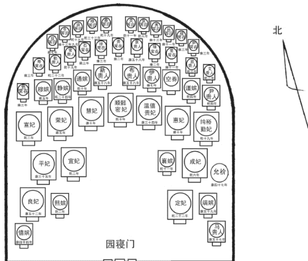 景陵妃园寝是清朝所有妃园寝中内葬人数最多的妃园寝,从葬入第一个妃子开始,到最后一个妃子结束,共经历了康、雍、乾三朝的八十八年之久,共葬有四十九人。按照由南往北的排列,她们的宝顶分为七层即七排,其中: