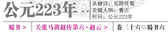 赵云,字子龙,常山郡真定县人,原是公孙瓒的部将。公孙瓒派刘备援助田楷去抵御袁绍的时候,赵云就跟随刘备,成为刘备主要的随从。等到刘备被曹操追赶到当阳长坂,抛下妻儿南逃时,赵云抱着刘备年幼的儿子,即后主刘禅,并保护着甘夫人,也就是刘禅的母亲,他们才得以免于死难。后来赵云升任为牙门将军。刘备进入蜀地时,赵云在荆州留守。