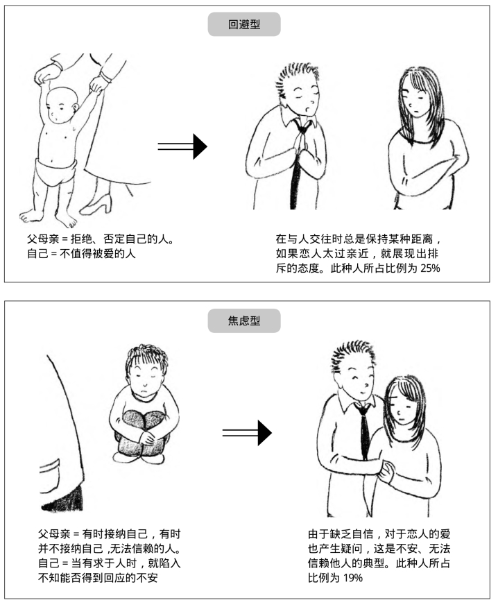 有人假设幼儿期的亲子关系,将影响成人之后的恋爱关系,这就是所谓的“爱情依附理论”。学者们将亲子关系分为安全依附型、回避型依附和焦虑型依附三种类型,借以建构分别与之相对应的恋爱模式。
