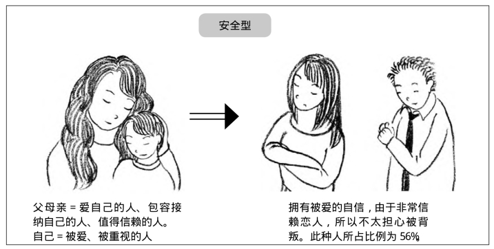 ①安全型依附:与伴侣的关系良好、稳定,能彼此信任、互相支持,从来不担心被抛弃也不回避和他人的过分亲密。