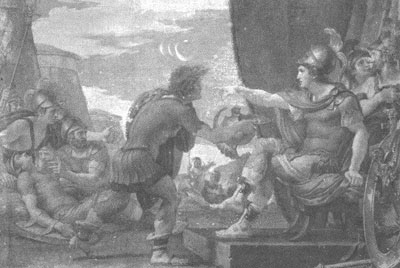 《亚历山大大帝拒绝喝水》(壁画)。亚历山大大帝(前356—前323),马其顿王国国王,世界史上著名的军事家、政治家。在其担任国王的13年里,他将王国的领土向东扩展到了印度西部,向西占领了埃及,建立了一个横跨欧亚非三大洲的庞大帝国。伴随着他的征服行动,希腊文化被传播到这些地区,形成了一个面积广大的泛希腊化地区