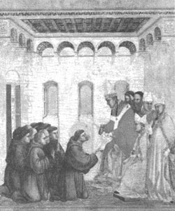 在维护正统教义方面的贡献比教皇还多的弗朗西斯(1182—1226年)是历史上最可爱的人物之一,他建立了著名的天主教托钵修会“方济各会”。他出生在一个富裕家庭,成年后放弃了俗世的所有财产,投入到了传道和慈善事业,他还和追随者们立誓永远过清贫的生活。弗朗西斯希望尽可能地用最严格的方式解释清贫誓约,因此,他要求信徒以行乞为生,除了受人款待之外,不许占有房产。1219年,弗朗西斯游历东方,当他回来时,他发现信徒们为自己盖了一间房子。他为此感到痛苦,但由于教皇的干涉,他作出了让步。这是后话了——英诺森三世认为,把弗朗西斯发起的这个运动维持在正统教义的层面会很有价值。于是,他认可了弗朗西斯的行为。格里高利九世更是如此,作为弗朗西斯的私人朋友,他虽然始终赞助着弗朗西斯,但也强加给了后者一些与内心冲动有抵触的戒律。弗朗西斯死后被追谥为圣者,但他制定的清贫戒律却被放松了。
