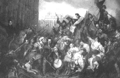 浪漫主义画作《比利时1830年革命》。十九世纪初期,民族主义成为浪漫艺术和政治哲学的一个中心题材,并掀起了重塑欧洲版图的民族自决风潮,形成了一种浪漫主义式的反抗。图中所绘的是1830年比利时人民为从尼德兰王国中独立出来而发动的革命