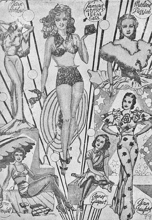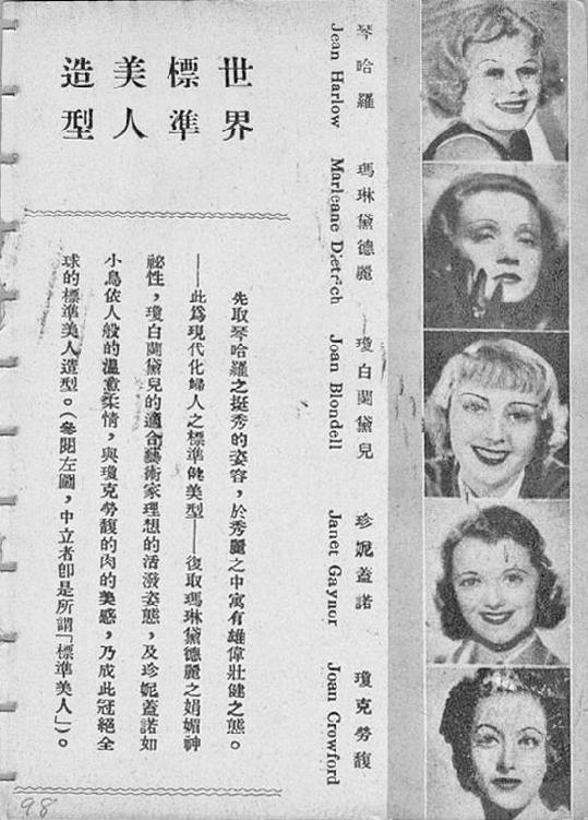 绚丽的好莱坞明星形象进一步肯定了健美是西方的时尚与审美。《玲珑》报道嘉宝(Greta Garbo)在1936年说:“健美是我们的生命线,是我们的衣食父母……适合我的运动是高尔夫和自行车。”(33) 美丽的脸孔和艺术天赋之外,健美的体格被视作在好莱坞成功的必要条件。在对健全身材的追求中,体育代替了节食。在一幅漫画里,《玲珑》把当红好莱坞影星珍·哈露(Jean Harlow)、玛琳·黛德丽(Marlene Dietrich)琼·布朗德尔(Joan Blondell)、珍妮·盖诺(Janet Gaynor)和琼·克劳馥(Joan Crowford)展示为现代女性美的代表。编者们仰慕黛德丽的“娟美神秘性”,布朗德尔“适合艺术家理想的活泼姿态”,盖诺“如小鸟依人般的温意柔情”,克劳馥“肉的美感”,推举哈露为“现代化妇人之标准健美型”。卡通中心宽肩长腿的人物是被描绘为“著名艺术家理想女孩”的布朗德尔,但《玲珑》的编者们将她诠释为综合了以上优点受到一致认同的全球“标准美人”。