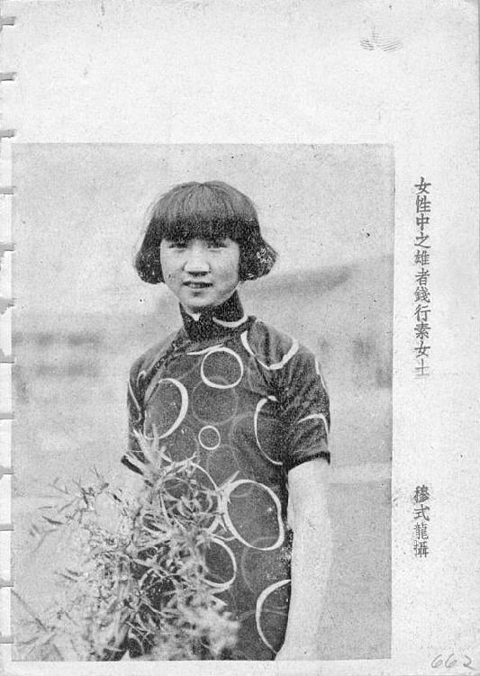 健美运动员还将体育运动因素带入当时时尚的照片姿势中。在“女性中之雄者”的标题下,全国短跑冠军钱行素留着时髦短发,身穿旗袍,站在一丛竹子后。
