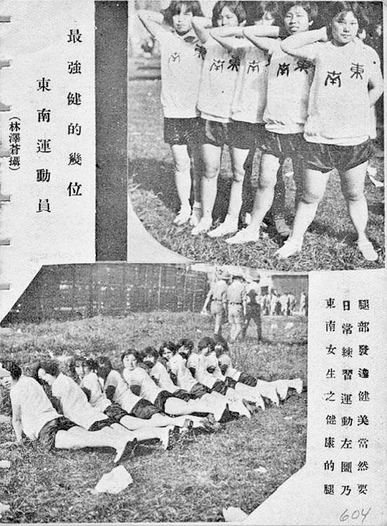 东南体育学校的五个粗腿的女孩左手藏在身后,右手肘向外举在脑后,被称作上海第二届中学生运动会上最强健的。在另一张展示“东南女生之健康的腿”的照片里,焦点是一排俯卧扭头对着镜头的姑娘们的腿。照片的文字说明解释说,“腿部发达健美当然要日常练习运动”(44) 。