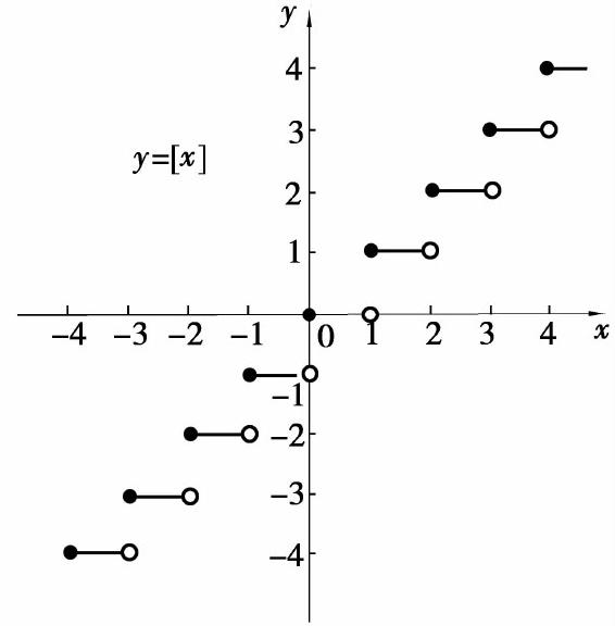 称为取整函数.这里[x]表示不超过x的最大整数,称为x的整数部分.它的定义域D=(-∞,+∞),它的图形如图1.4所示.