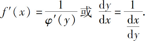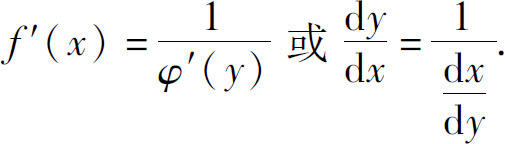 定理2 如果函数x=φ(y)在某区间内单调、可导且φ′(y)≠0,则它的反函数y=f(x)在对应区间内可导,并且