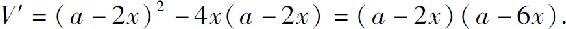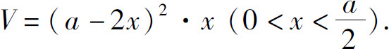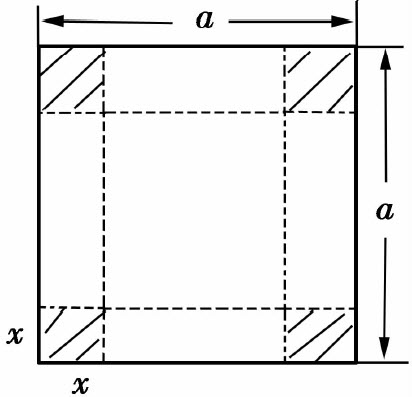 解 设小正方形的边长为x,则正方形箱底的边长为a-2x,如图3.9所示,于是无盖箱体积为