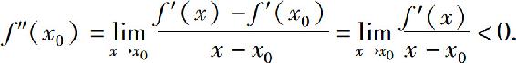 证 (1)由于f″(x0)<0,按二阶导数定义及f′(x0)=0,得